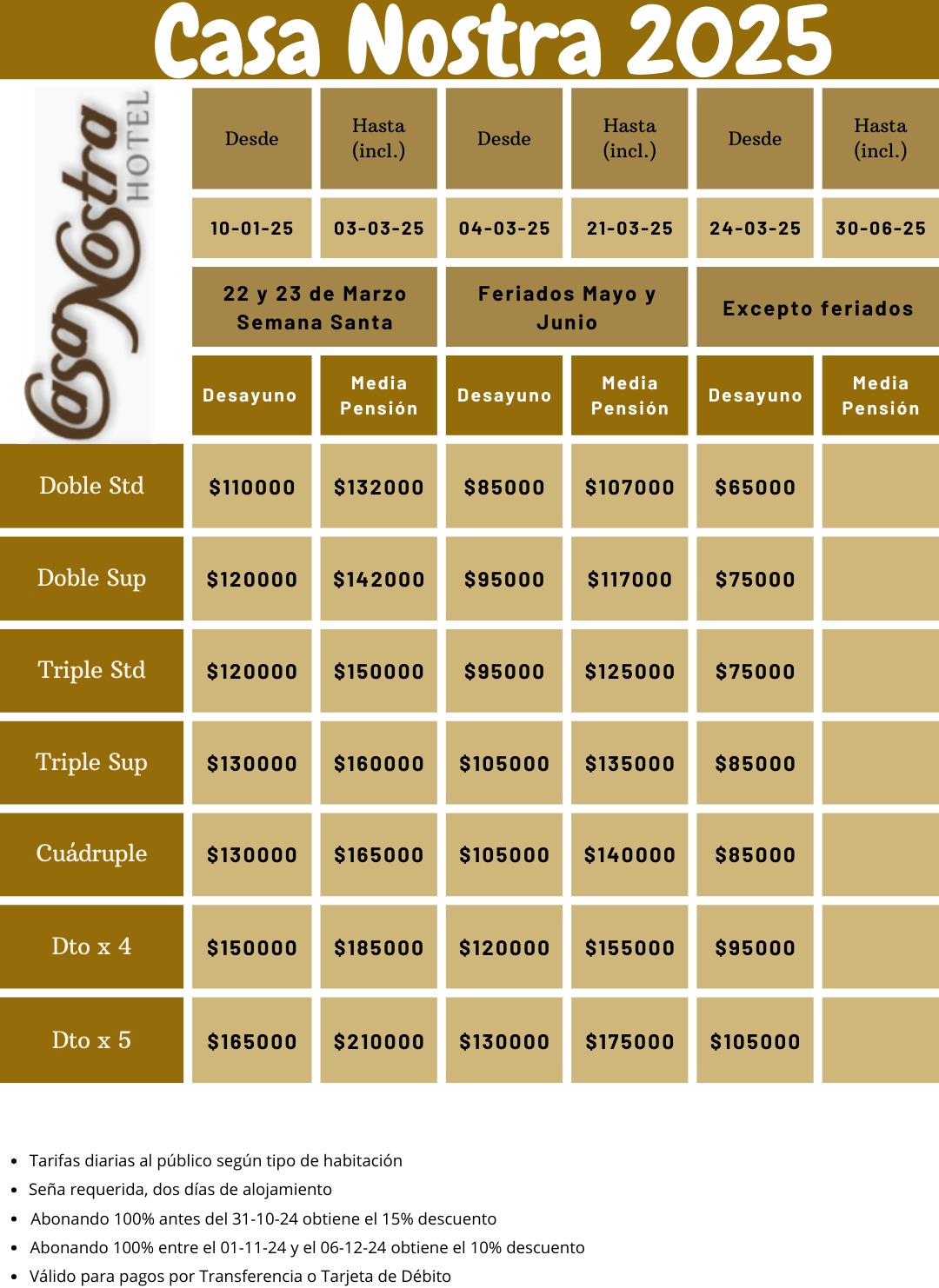 La media pensión (cena) es de estilo buffet libre con postre y no incluye bebida. Las cocheras techadas estan incluidas para habitaciones superiores y para estándares puede ustilizarse la playa de estacionamiento según disponibilidad. Para los viajes estudiantiles, usamos el sistema de salad bar y lunchonera con ocho platos calientes diferentes.